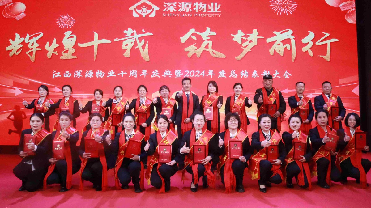 2025 年 2 月 15 日,江西深源物业 “辉煌十载 筑梦前行” 成立十周年庆典暨 2024 年度总结表彰大会在喜庆氛围中圆满举行。公司全体领导、股东及管理精英、员工代表齐聚一堂,共同回顾十年辉煌,展望美好未来。