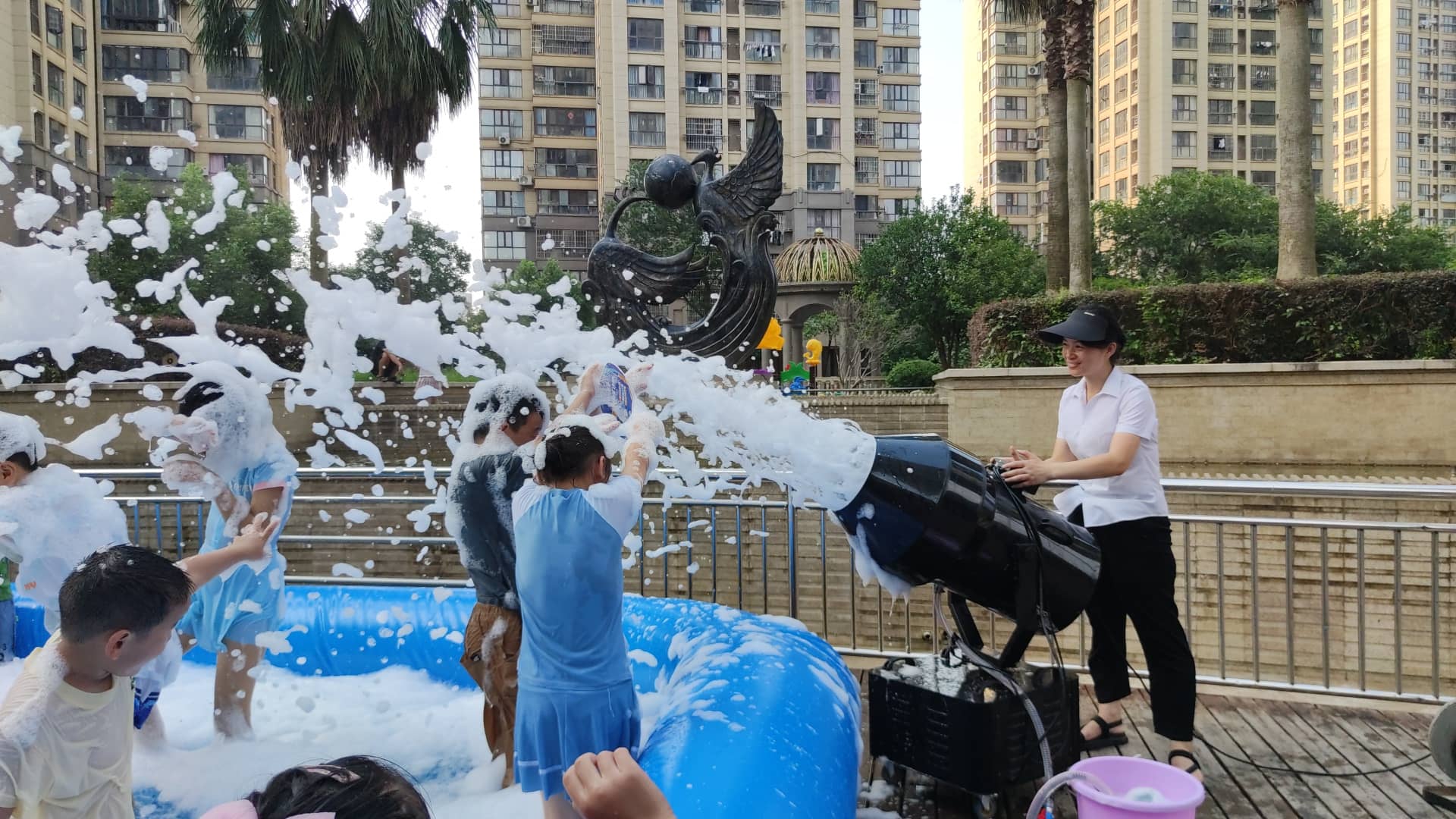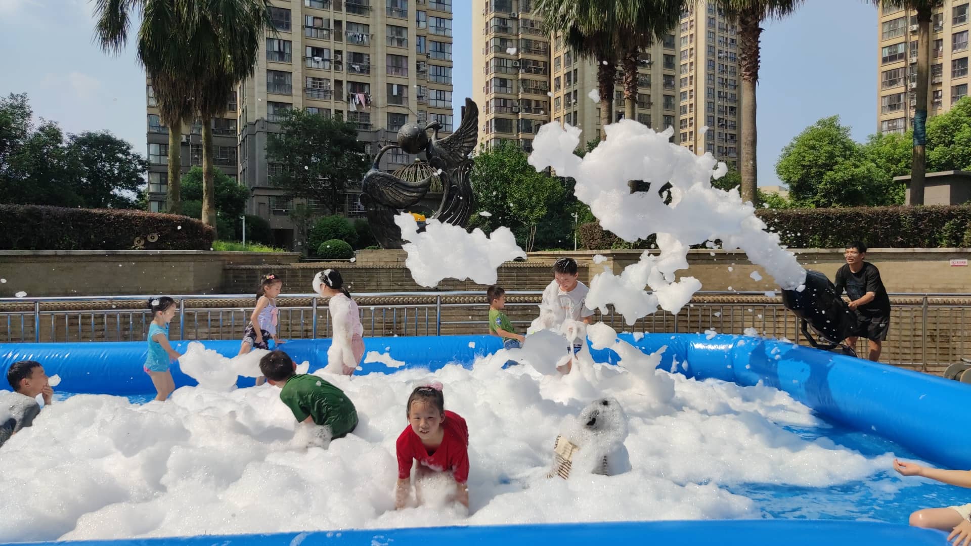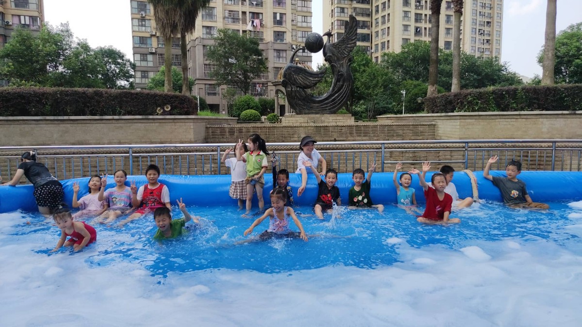 7月8日下午三点半,当烈日逐渐西斜,小区休闲区域却迎来了朂热闹的时刻。物业工作人员精心布置了充气泳池,放满了水,并把泡泡机开始运转,刹那间,无数洁白如雪的泡泡如瀑布般倾泻而下,将整个泳池区域变成了梦幻的“泡泡王国”。孩子们欢呼雀跃,迫不及待地冲进这片泡泡的海洋,有的张开双臂迎接从天而降的“雪花”,有的调皮地将泡泡捧起吹向小伙伴,还有的索性躺在泡泡堆里打滚,尽情享受这份夏日独有的清凉与快乐。