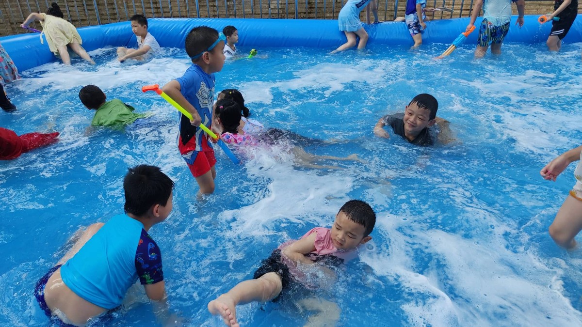 泡泡大战持续了近两个小时,期间还穿插了水上拔河、水枪对战等趣味游戏。孩子们分组竞技,加油声、欢笑声此起彼伏,泳池变成了欢乐的海洋。不少家长也被这欢乐氛围感染,纷纷加入游戏行列,与孩子们一起重温童年的快乐。活动结束时,虽然每个人都湿漉漉的,但脸上洋溢的笑容和眼中闪烁的兴奋光芒,无不显示着这场活动的成功。
