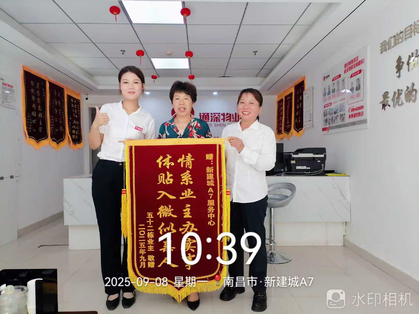 2025年7月暑假期间,新建城A7区52-102业主外出游玩,无法照看院内花草与鱼类,管家邓花主动承担托管责任,以细致服务获业主赠旗致谢。