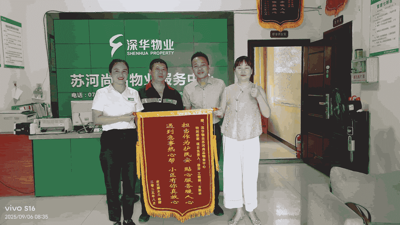 8月22日,配件到货后,物业1小时完成安装;8月23日,业主送“高效处置解民忧 贴心服务暖人心”锦旗致谢,称“多亏物业帮我解决大麻烦”。
