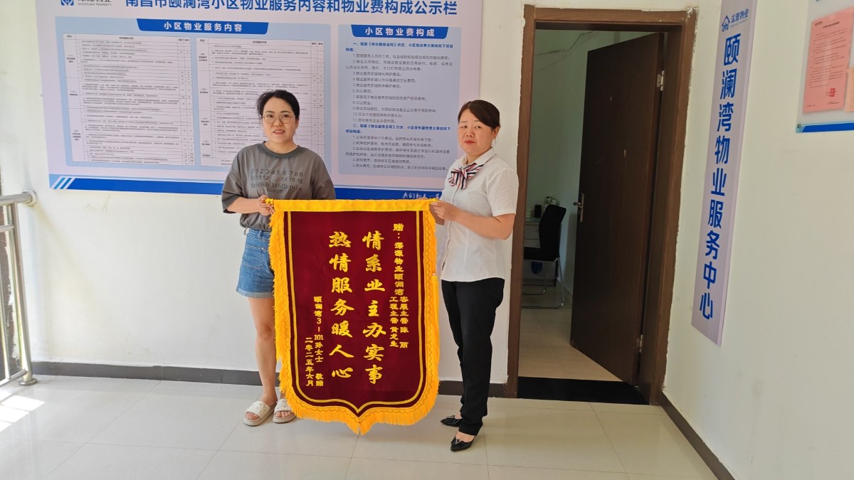 颐澜湾3栋1单元101室业主家中空开坏了,黄主管帮忙维修;第二次家里灯坏,造成短路,家里没有电,煮不了饭,影响正常生活,当时正下大雨,黄主管冒雨帮业主买来灯泡和开关,及时维修好解决业主燃眉之急。为此业主特意送来一面锦旗,这传递的不仅是业主的感激,更是体现了物业团队“急业主所急”的服务热情与责任。