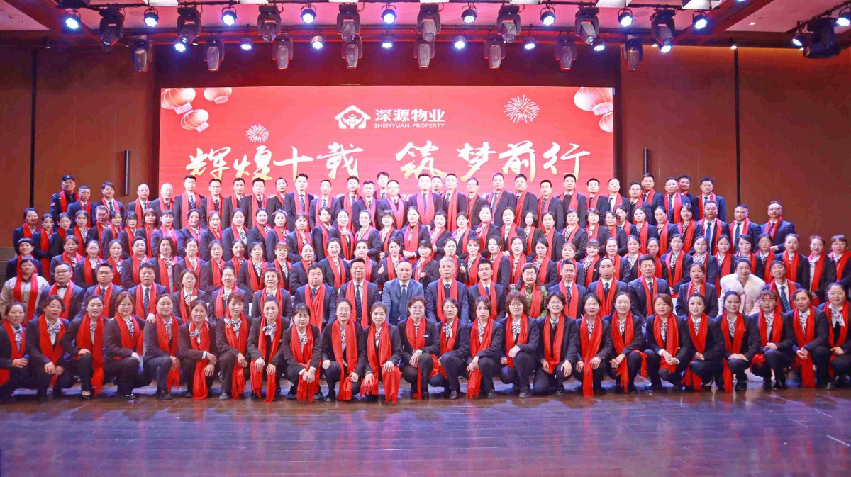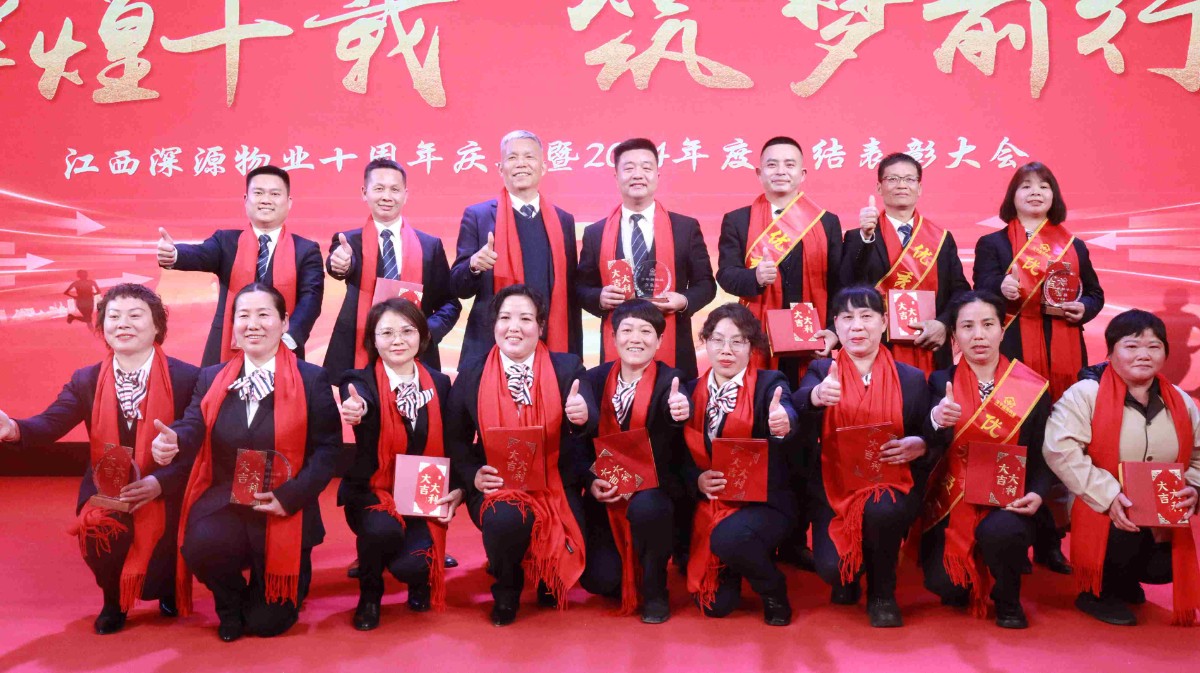 2025 年 2 月 15 日,江西深源物业 “辉煌十载 筑梦前行” 成立十周年庆典暨 2024 年度总结表彰大会在喜庆氛围中圆满举行。公司全体领导、股东及管理精英、员工代表齐聚一堂,共同回顾十年辉煌,展望美好未来。