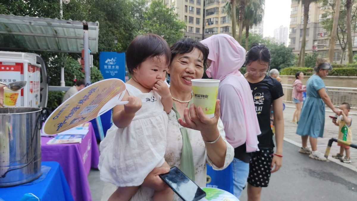 为了让这份夏日的欢乐持续更久,客服小姐姐还精心准备了冰激凌和冰镇绿豆汤,在泳池对面设立清凉驿站,为孩子们和业主们送上消暑美食。孩子们在家长的陪伴下陆续前来,排队领取冰激凌和绿豆汤。物业小姐姐热情服务,确保每位小朋友都能得到心仪的清凉美味。一位领到巧克力味冰激凌的小男孩兴奋地说:”玩泡泡太开心了,还有冰淇淋吃,这个暑假太棒了!”