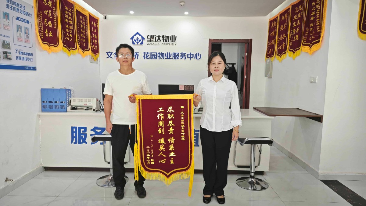 近日,小桥花园 4-2-504 住户大伯向物业服务中心赠送锦旗,感谢工作人员两次暖心相助。