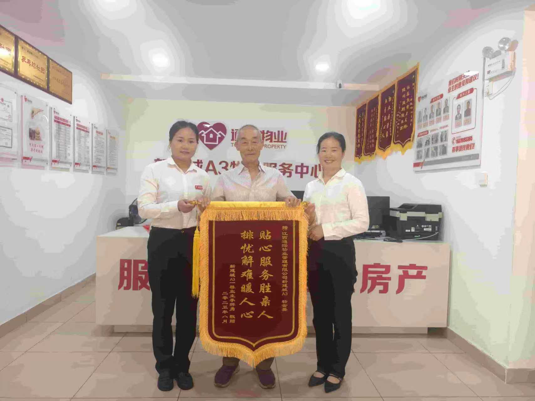 近日,新建城 A31-1-2403 业主特地向物业送来一面锦旗,表示对物业员工日常照料家中老父亲的感激之情。