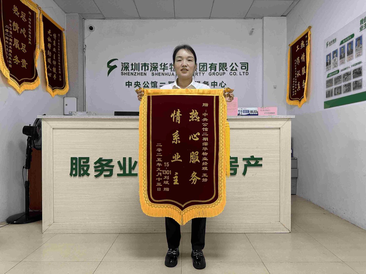 中央公馆小区15栋1301业主,有感于物业团队的长期优质服务,特向项目经理王静赠送锦旗。日常中,物业不仅及时解答业主疑问,还主动处理楼道杂物、检修公共设施;节日期间,更会组织社区活动丰富业主生活。业主此举,既是对王静经理工作的肯定,也是对中央公馆物业全体工作人员用心服务的感谢。